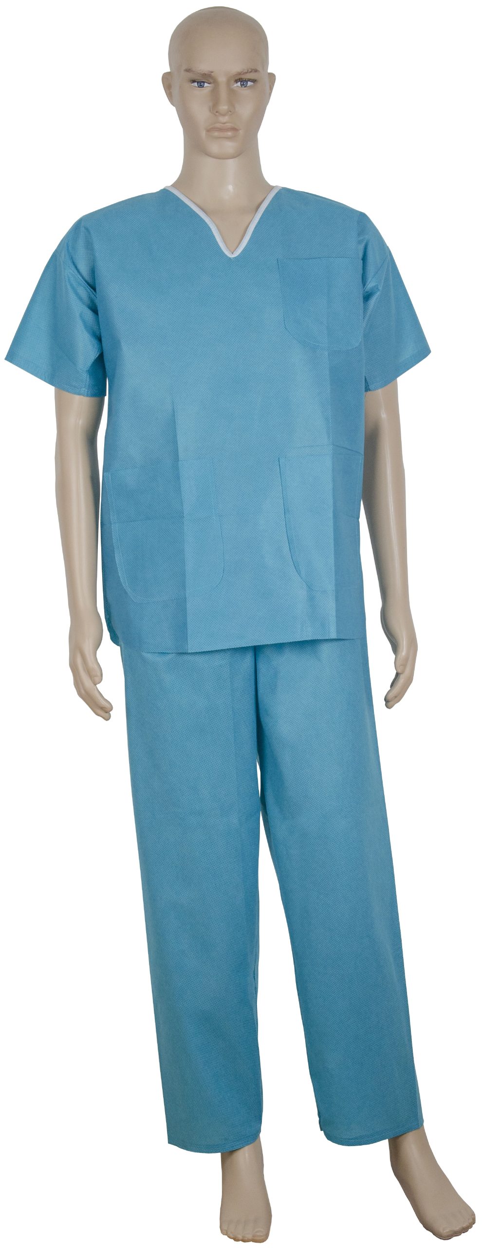 Komplet odzieży chirurgicznej jednorazowego użytku mający zastosowanie ochronne w gabinetach zabiegowych i na blokach operacyjnych. Zestaw to bluza z krótkimi rękawami, z wycięciem pod szyją w kształcie V wykończonym lamówką z trzema kieszeniami oraz spodnie z trokami w pasie. Komplet wykonany z miękkiej antystatycznej włókniny polipropylenowej typu SMS.