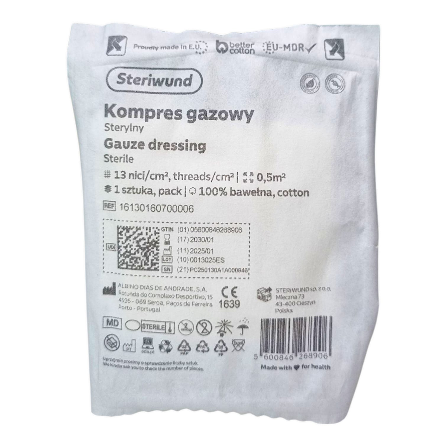 Kompres gazowy Steriwund wykonany w 100% z gazy bawełnianej, bielony metodą bez chlorową gwarantująca wysoki poziom czystości chemicznej. Kompres stosowany jest do ogólnego opatrywania ran. Stanowi najpopularniejszy produkt przy zmianie opatrunku.