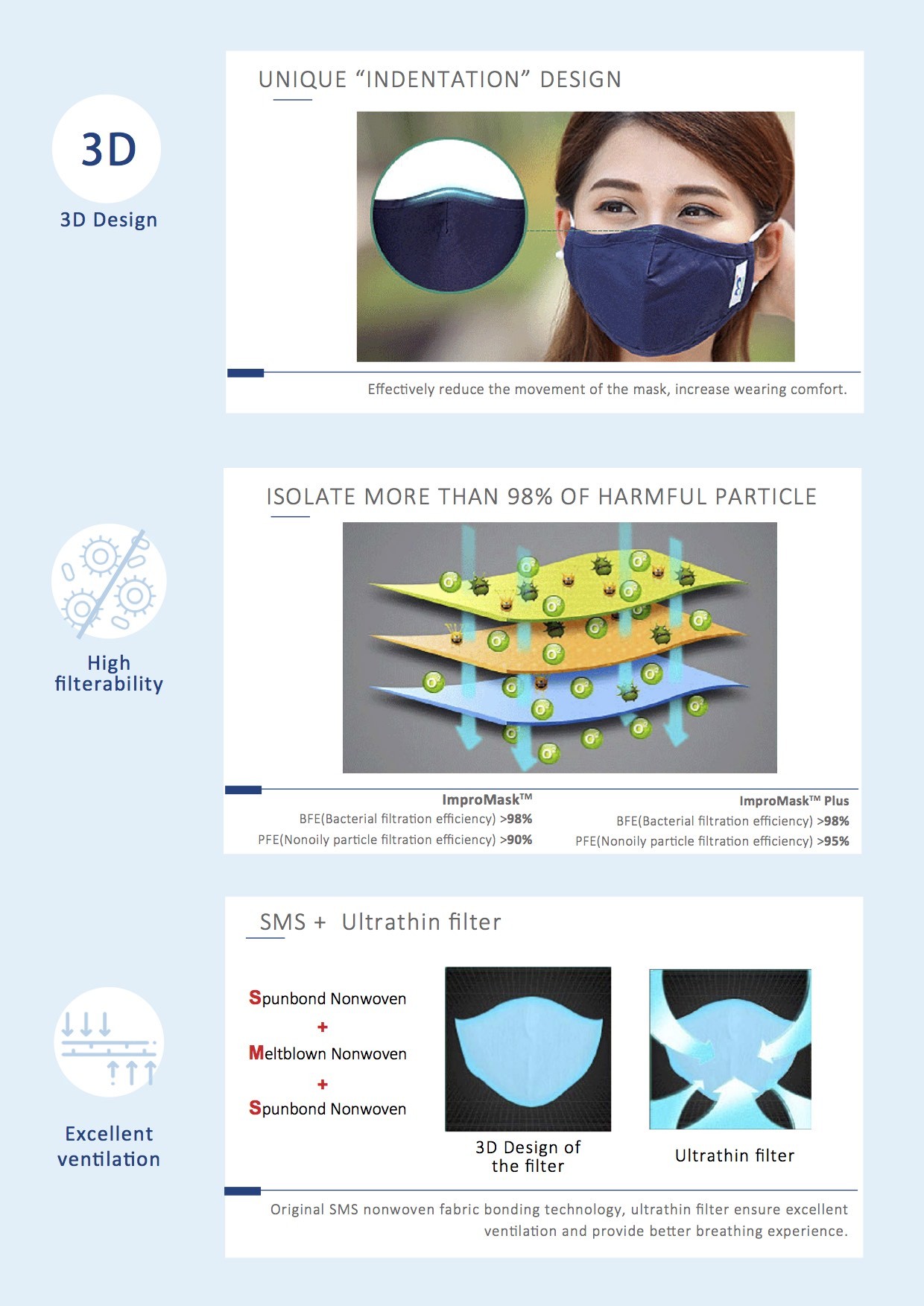 Oryginalna technologia łączenia włóknin SMS oraz ultracienki filtr zapewniają doskonałą wentylację i zapewniają lepsze oddychanie.
