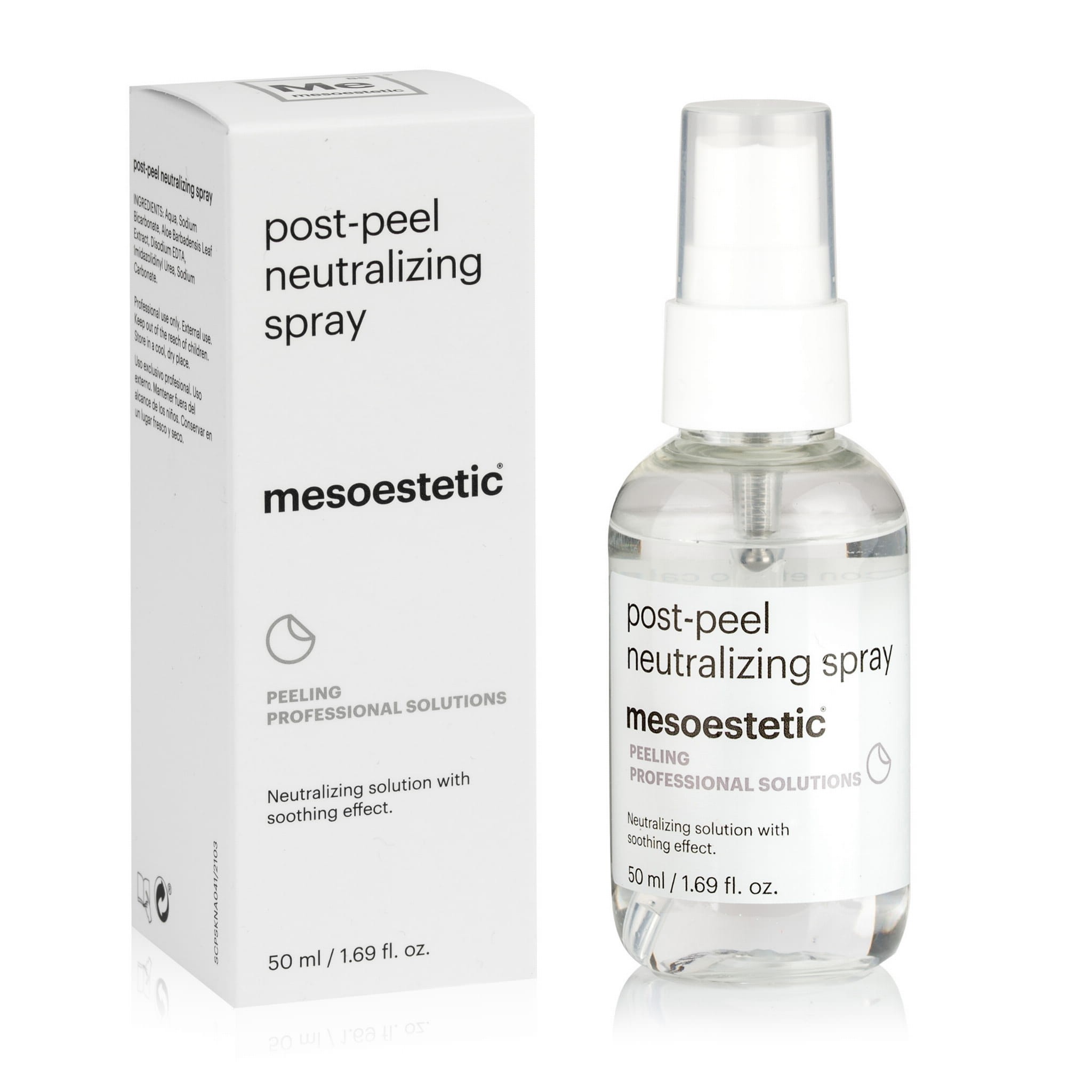 Mesoestetic Post Peel Neutralizing Spray to preparat rekomendowany do zabiegów z użyciem peelingów chemicznych. Doskonale neutralizuje działanie kwasów, łagodzi podrażnienia i wycisza skórę. Wygodna forma butelki z atomizerem ułatwia dozowanie produktu.