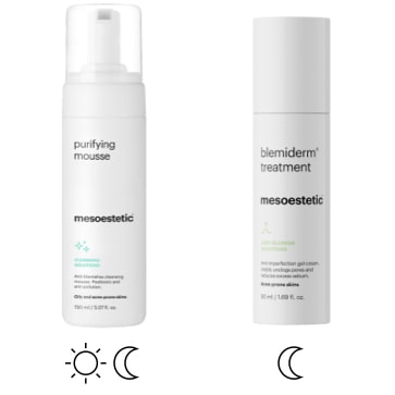 Mesoestetic Blemiderm Pack jest profesjonalną kuracją dedykowaną do redukcji trądziku II-III stopnia. Oparty na najnowszych dowodach naukowych zabieg korygujący aktywne zmiany trądzikowe, oraz regulujący mechanizmy wyzwalające zmiany trądzikowe i przywracający jakość skórze tłustej z aktywnym trądzikiem.