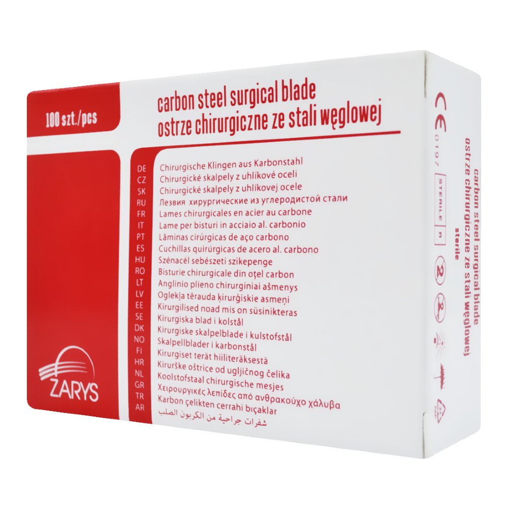 Ostrze chirurgiczne nr. 10 ze stali węglowej do skalpela. Naostrzone wzdłuż jego najdłuższej krawędzi, dodatkowo wyposażone w mocną, szpiczastą końcówkę.