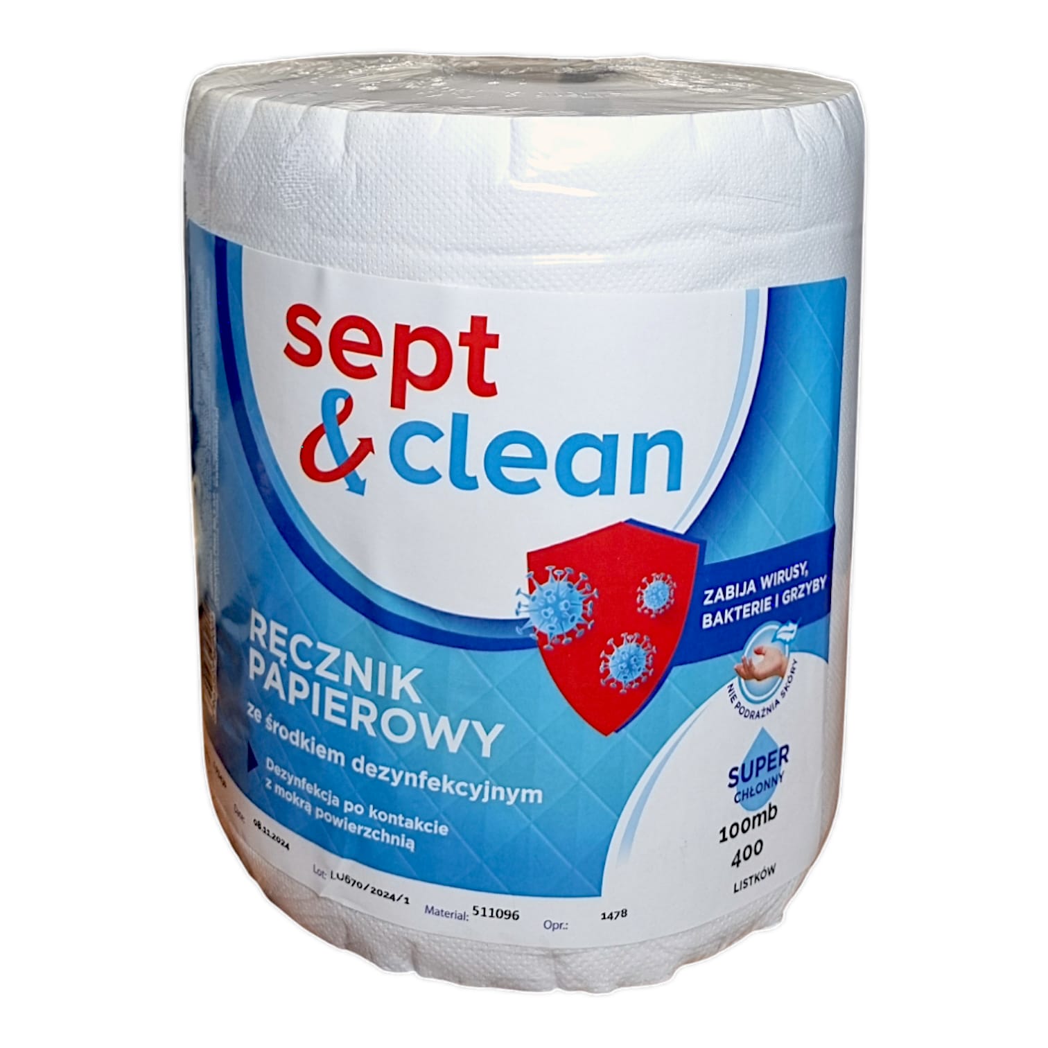 Ręcznik papierowy w roli Sept&Clean ze środkiem dezynfekującym, przeznaczony do czyszczenia mokrych powierzchni oraz osuszania i dezynfekcji rąk.