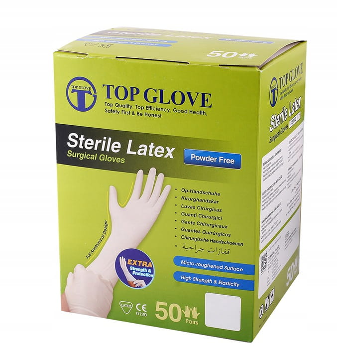 Rękawice chirurgiczne lateksowe TOP GLOVE PF – bezpudrowe, sterylne, 1 para