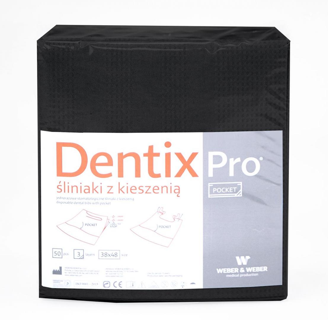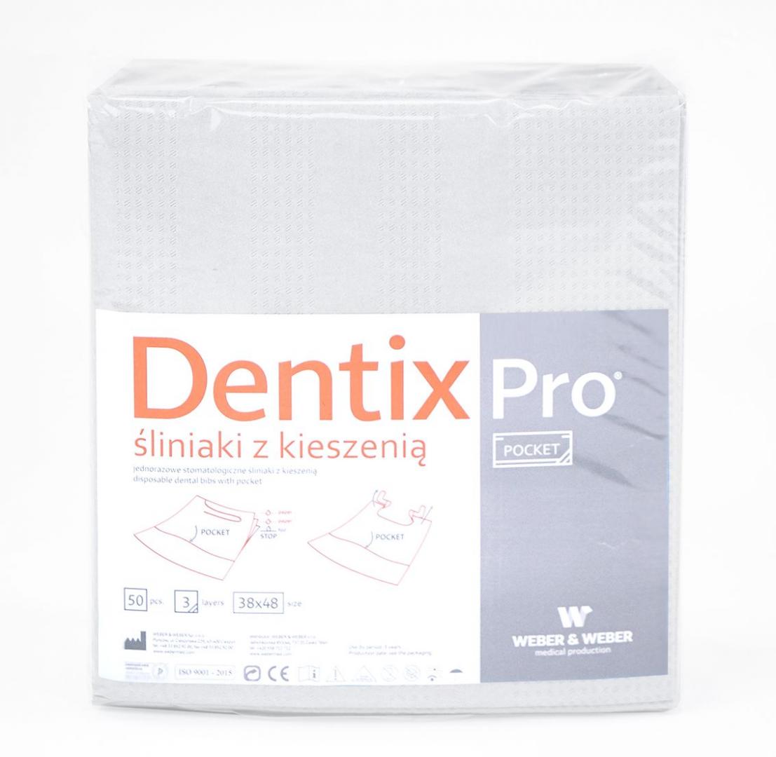 Śliniaki dentystyczne DentixPro z kieszenią zaprojektowane zostały do stosowania w gabinecie stomatologicznym, czy ortodontycznym. Praktyczna kieszeń w dolnej części śliniaka może posłużyć jako miejsce na zużyte podczas leczenia materiały dentystyczne, które mogą zostać zutylizowane wraz ze śliniakiem. Specjalny, głęboki wykrój pod szyją sprawia, że produkt doskonale chroni ramiona pacjenta.