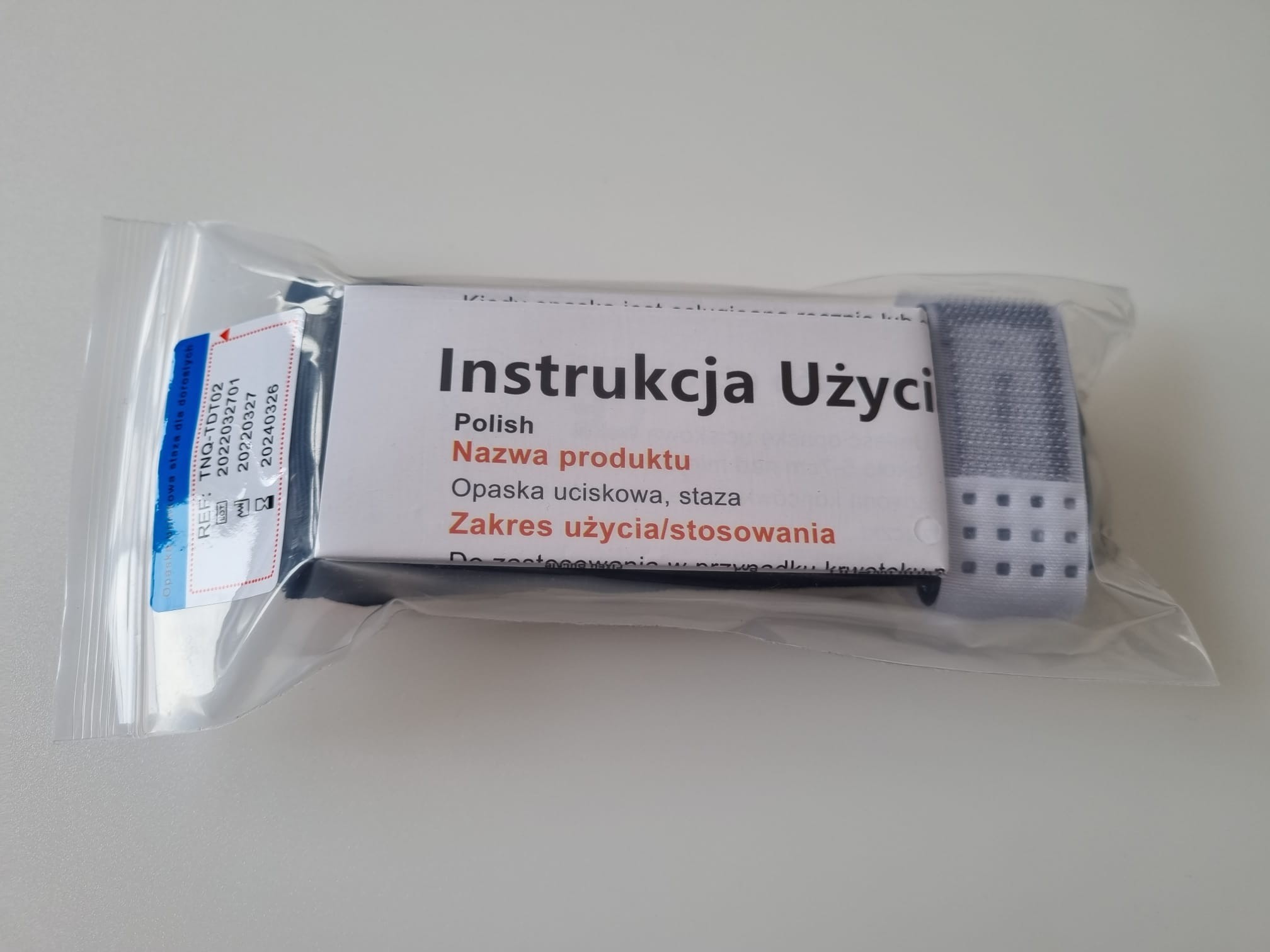 - Długi rzep umożliwia łatwe rozluźnienie opaski, nałożenie jej na skaleczona kończynę, a następnie jedną ręką regulację długości opaski (zaciśniecie) i dociągnięcie krępulca, aż do ustania krwawienia
