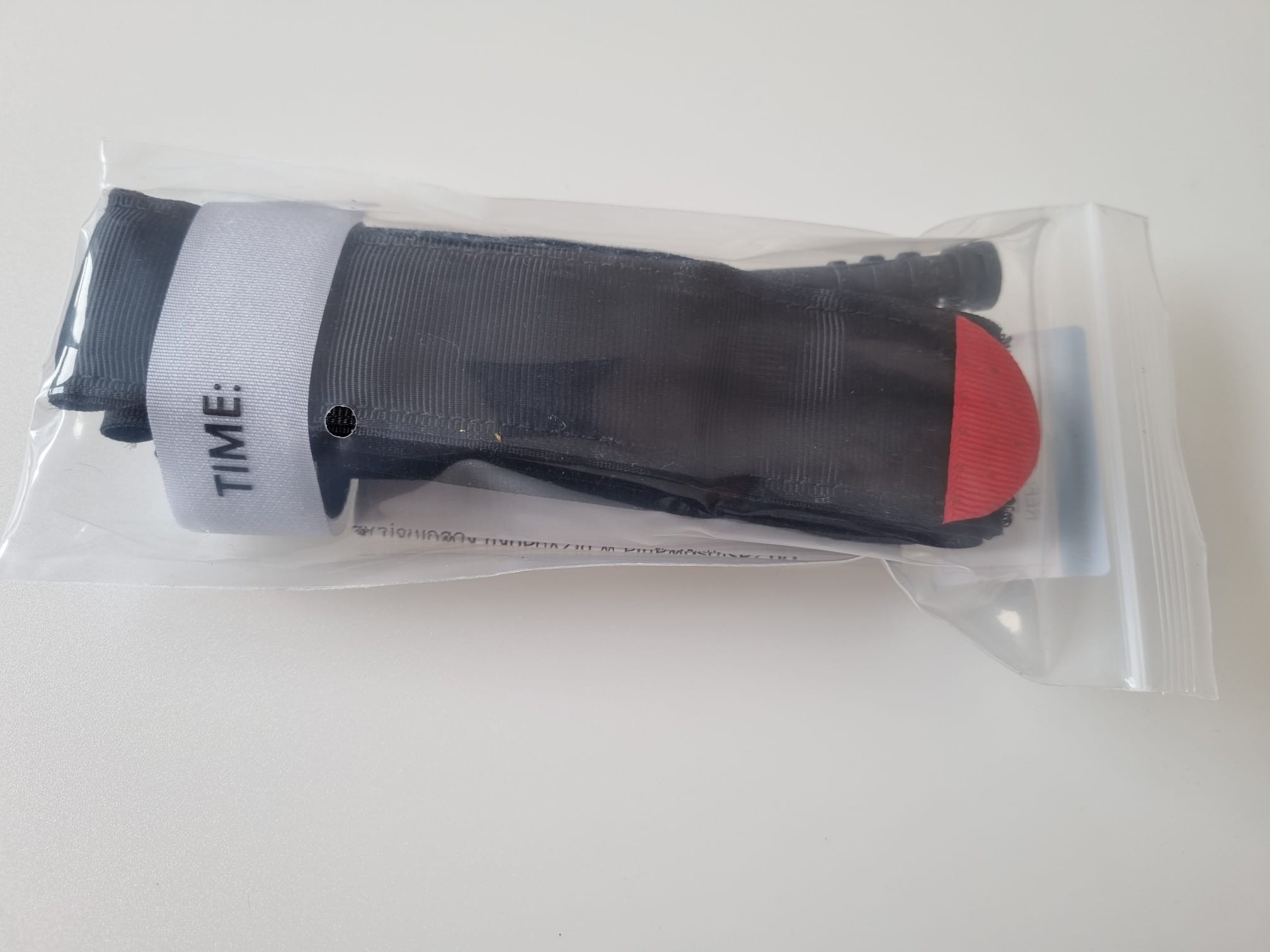 - Zabezpiecz krępulec paskiem znajdującym się na klipsie mocującym. Wpisz czas założenia stazy na pasku lub w widocznym miejscu na ciele poszkodowanego.