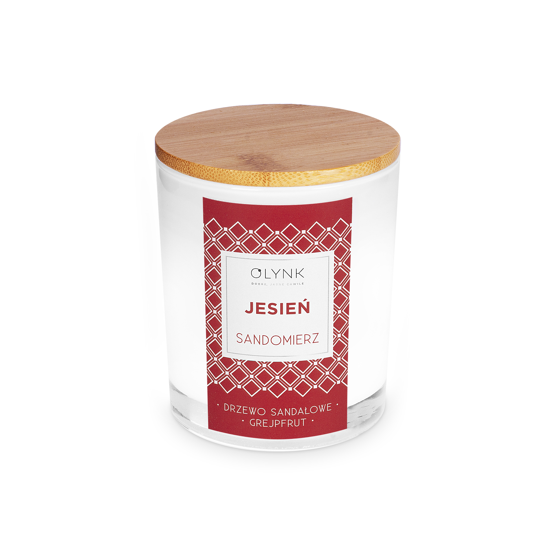 Świeca z wosku sojowego w szkle – JESIEŃ Sandomierz (drzewo sandałowe – grejpfrut), 280ml