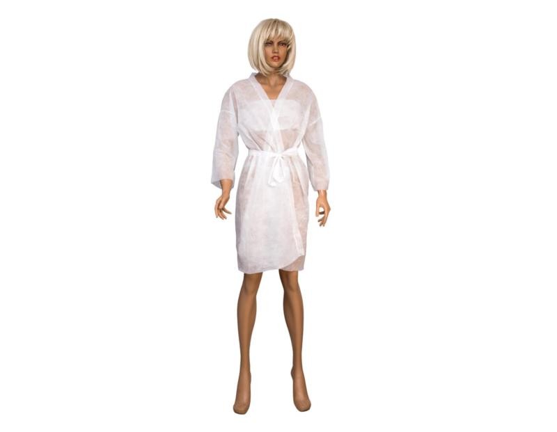 Wiązany szlafrok z włókniny jednorazowego użytku przeznaczony do stosowania podczas zabiegów w gabinetach kosmetycznych i salonach spa.