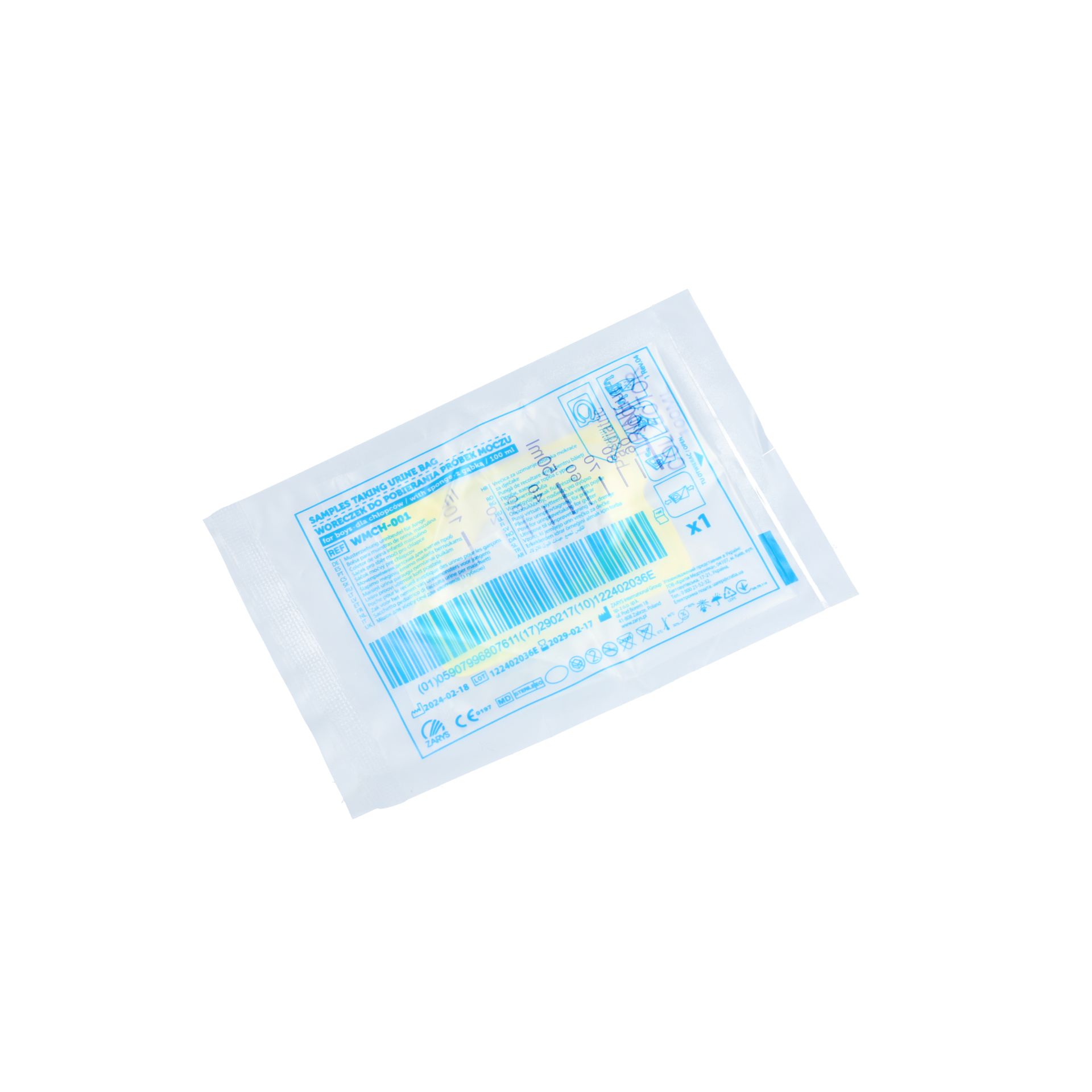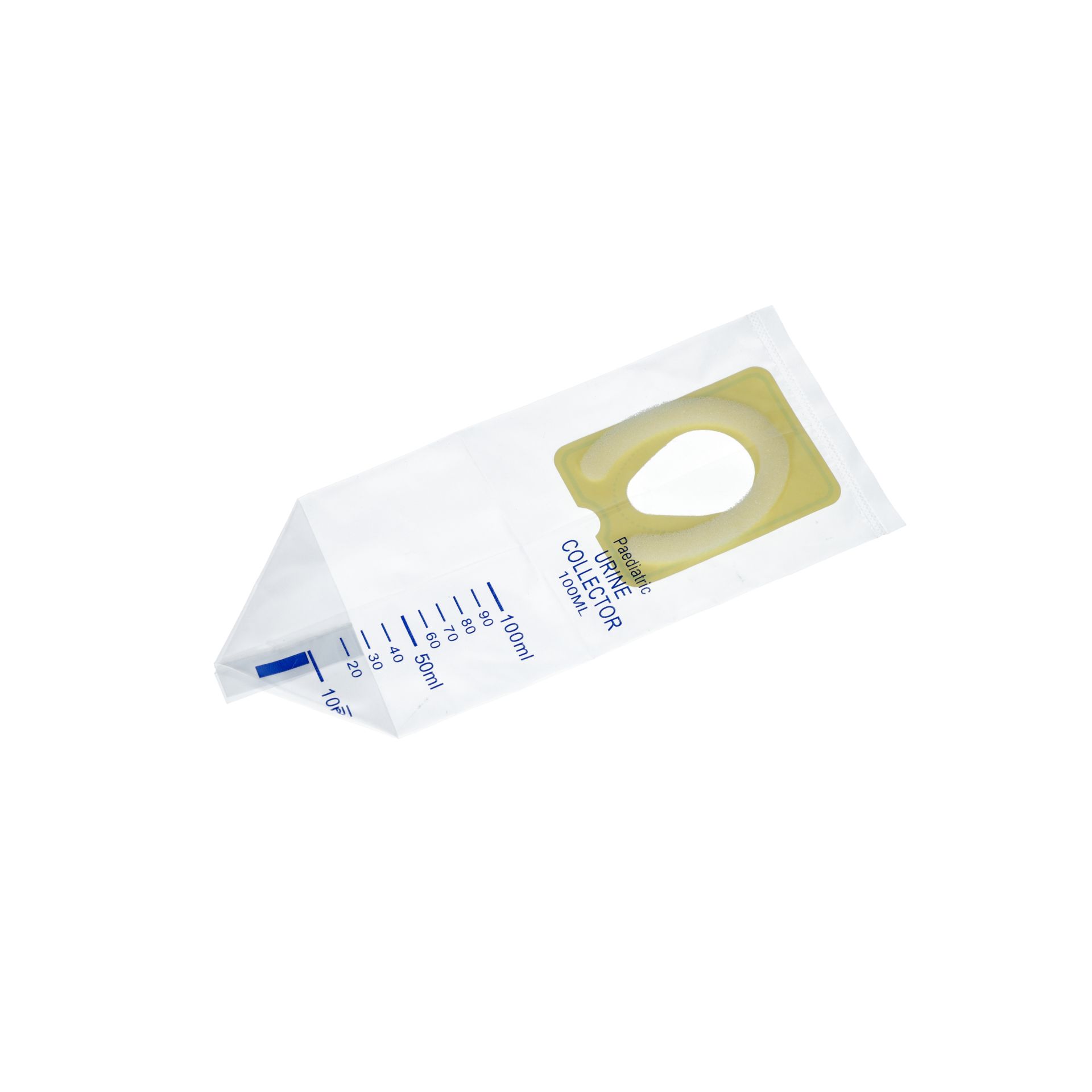 Bezlateksowy woreczek do pobierania próbek moczu o pojemności 100 ml. Sterylny wyrób jednorazowego użytku, przeznaczony do zbiórki moczu i pobierania próbek od niemowląt i małych dzieci, dedykowany chłopcom. Wykonany z delikatnej, mocnej folii PE. Samoprzylepna część woreczka pokryta antyalergicznym klejem, dodatkowe uszczelnienie wykonane z antyalergicznej pianki.