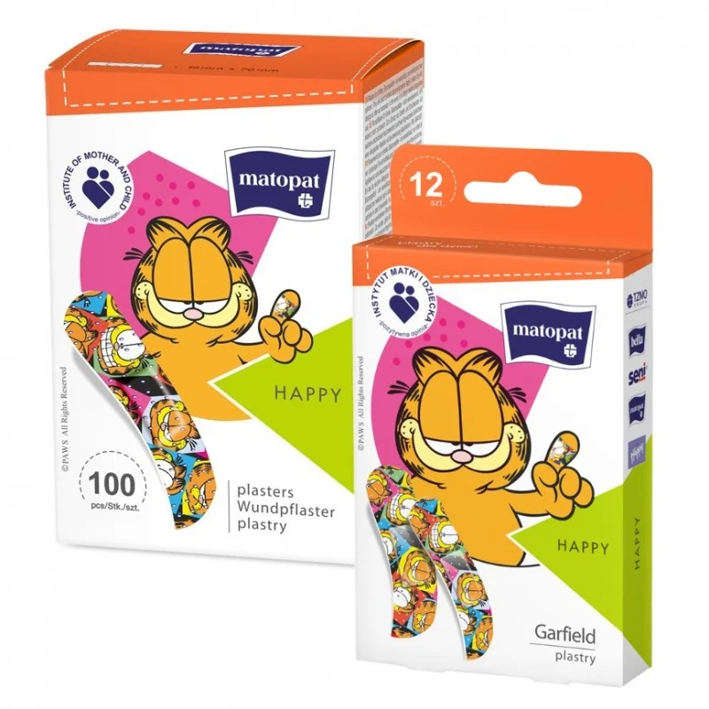 Plastry dla dzieci i młodzieży HAPPY z kotem Garfieldem stosowane do opatrywania drobnych otarć i skaleczeń. Zawierają opatrunek chłonny, a ich zewnętrzna strona została pokryta kolorowym nadrukiem z postacią z kreskówki.